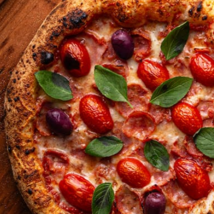 Molho de tomate italiano, base levinha de parmesão e muçarela, calabresa artesanal levemente picante, tomate sweet grape, manjericão e azeitona preta. Pizzas individuais com diâmetro de 26cm