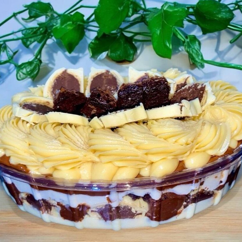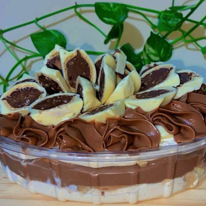 Feito com Mousse de Ninho, brigadeiro de Chocolate cremoso, intercalando com biscoito maizena, finalizado com Ouro Branco fatiado e ganache de chocolate Branco. Doce muito querido por aqui, muito saboroso e encantador.
