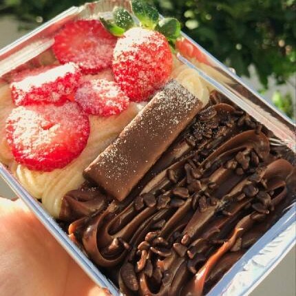 Brownie suculento feito com chocolate nobre blend, coberto metade brigadeiro de Ninho cremoso, metade brigadeiro de chocolate cremoso, finalizado com granulado ao leite, chocolate tipo Wafer e morango fatiado. Aproximadamente 190 gramas.