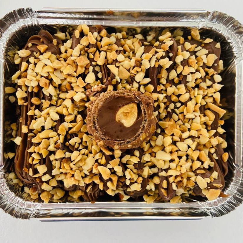 Brownie suculento feito com chocolate nobre blend, coberto com brigadeiro de chocolate cremoso, Nutella, mix de castanhas com amendoim triturado e meio bombom Ferrero Rocher. Aproximadamente 190 gramas.