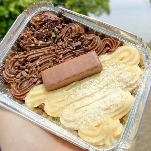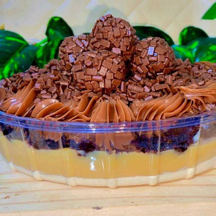 Feita com mousse de Ninho, brigadeiro de Ninho cremoso, camada com nosso brownie feito com chocolate nobre blend, brigadeiro de chocolate cremoso, finalizado com granulado nobre ao leite e 5 brigadeiros enrolados. Travessa TAMANHO P , peso de 850 gramas. Medidas internas da travessa 16,5 de comprimento X 12 largura X 8 altura.( Em dúvidas com o tamanho da travessa conferir as medidas descritas acima antes de realizar o pedido).
