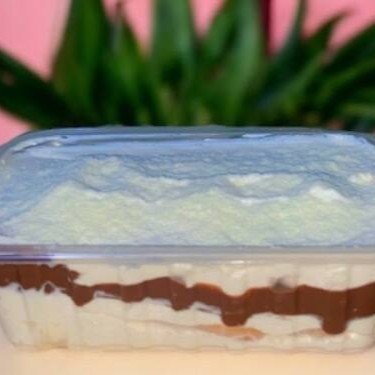 Feito com Mousse de Ninho, camada de Nutella, intercalando com biscoito de maizena, finalizado com leite Ninho polvilhado.