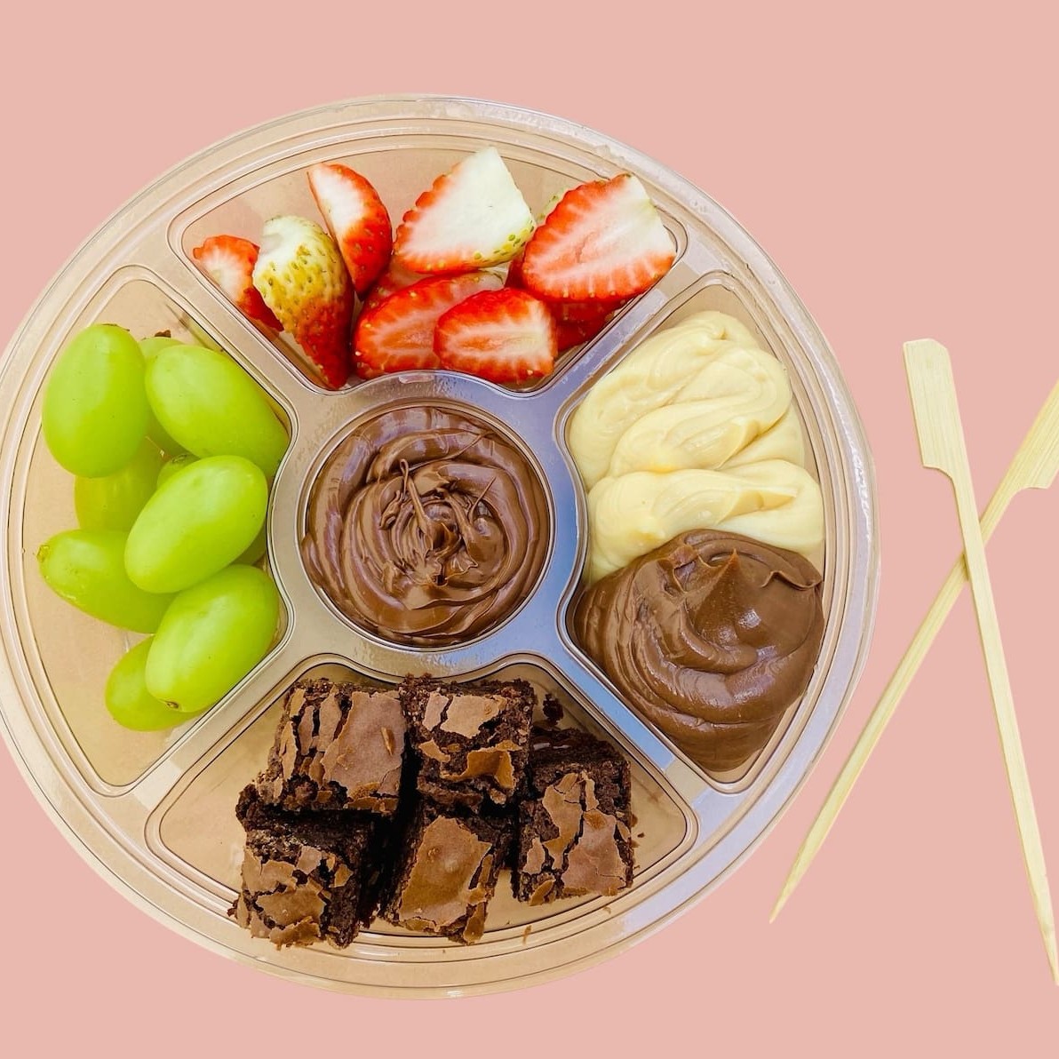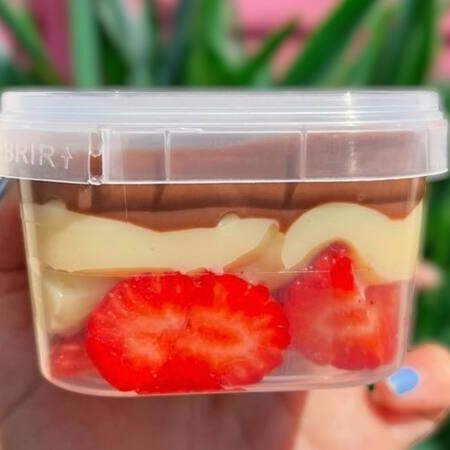 Contem uvas verde sem semente, morango fatiado, pedaços de brownie feito com chocolate nobre, brigadeiro de Ninho cremoso, brigadeiro de chocolate cremoso e Nutella. (Os cremes chegam em temperatura ambiente). Peso total 390 gramas.