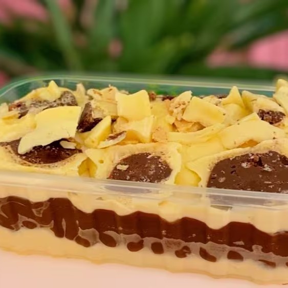 Feito com mousse de Ninho, brigadeiro de Chocolate cremoso, intercalando com biscoito de maizena, finalizado com Bombom Ouro Branco e ganache de chocolate Branco. Doce muito querido por aqui . Travessa TAMANHO P, peso de 800 Gramas. Medidas internas da travessa 16,5 cm comprimento X 12 cm largura X 8 cm altura. ( Em dúvidas com o tamanho da travessa conferir as medidas descritas acima antes de realizar o pedido).