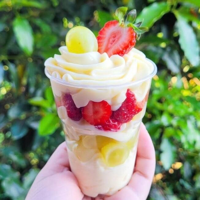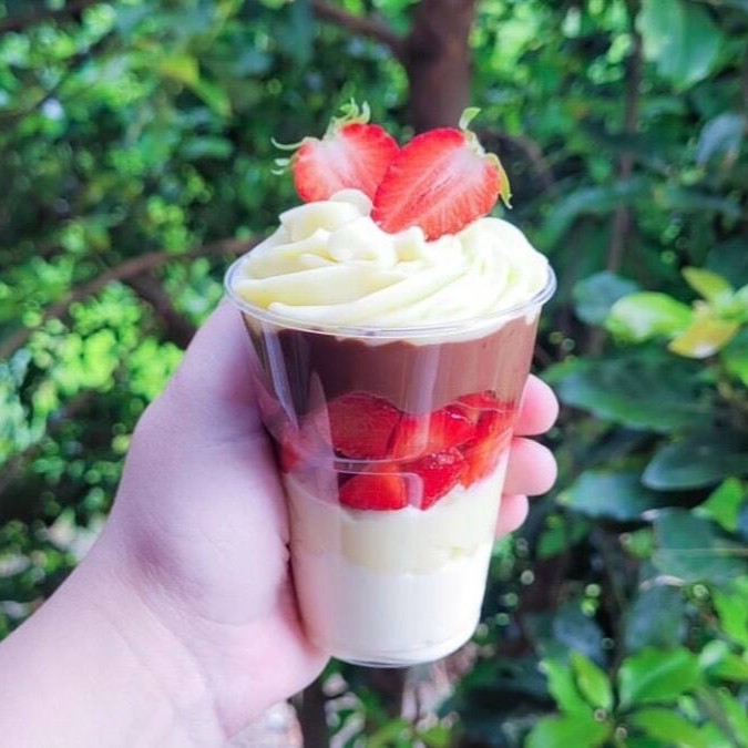 Composto por camada de Uva verde sem semente fatiada, Morango fatiado, Mousse de Ninho e Brigadeiro de Ninho cremoso. Copo leve e muito saboroso, muito pedido em dias quentes.