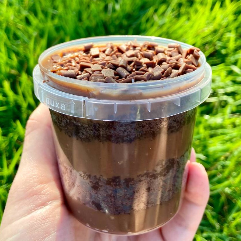 Massa feita com cacau 50%, recheio de brigadeiro de chocolate cremoso, finalizado com granulado nobre ao leite. (Nova embalagem pote 220ml)