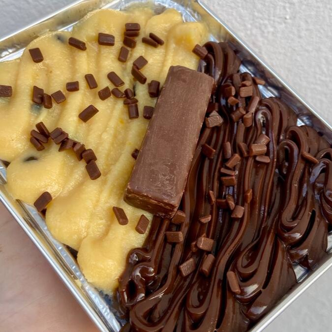 Brownie suculento feito com chocolate nobre blend, coberto metade brigadeiro de Ninho cremoso, metade brigadeiro de chocolate cremoso, finalizado com granulado nobre, Ninho polvilhado e chocolate tipo Wafer. Aproximadamente 190 gramas.