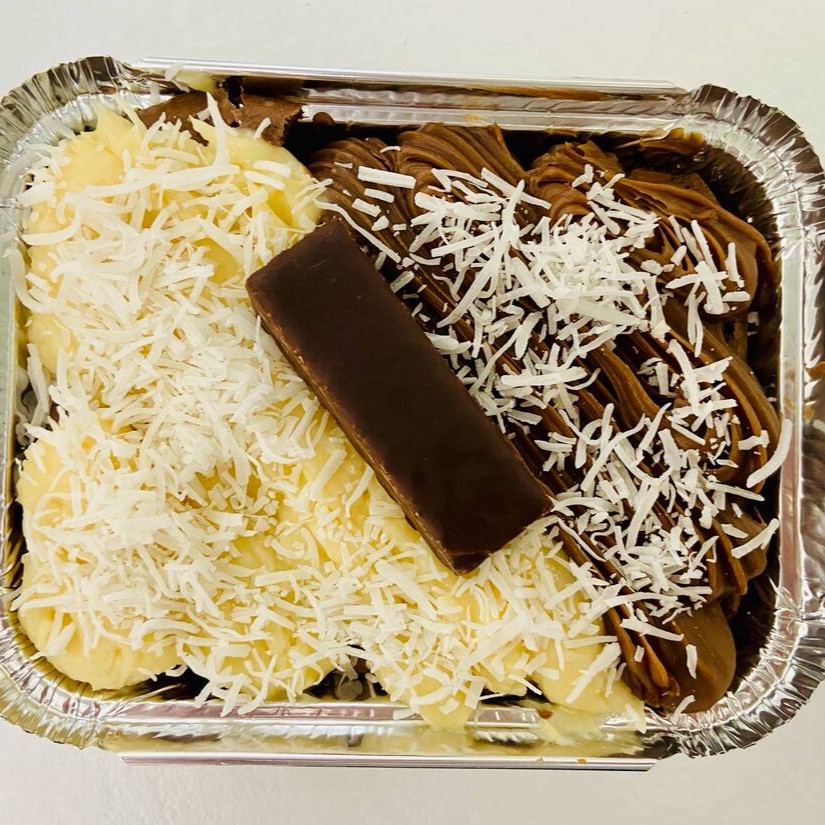 Brownie suculento feito com chocolate nobre blend, coberto metade brigadeiro de chocolate cremoso, metade creme de beijinho, finalizado com coco ralado e chocolate tipo Wafer. Aproximadamente 190 gramas.