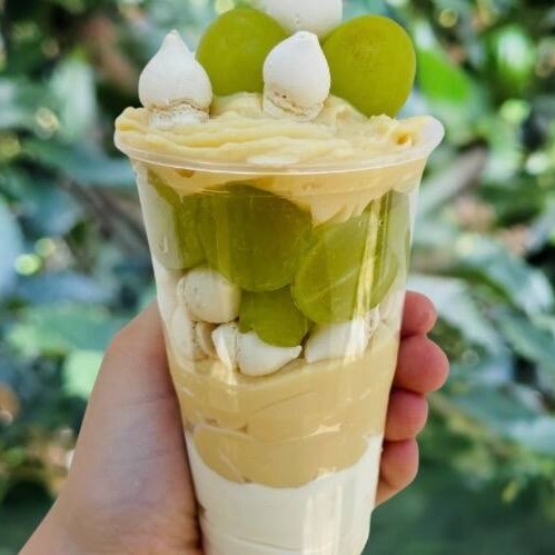 Camada de uva verde fatiada sem semente, mousse de Ninho , brigadeiro de Ninho cremoso e camada de mini suspiros. Sobremesa leve, muito escolhida em dias quentes.