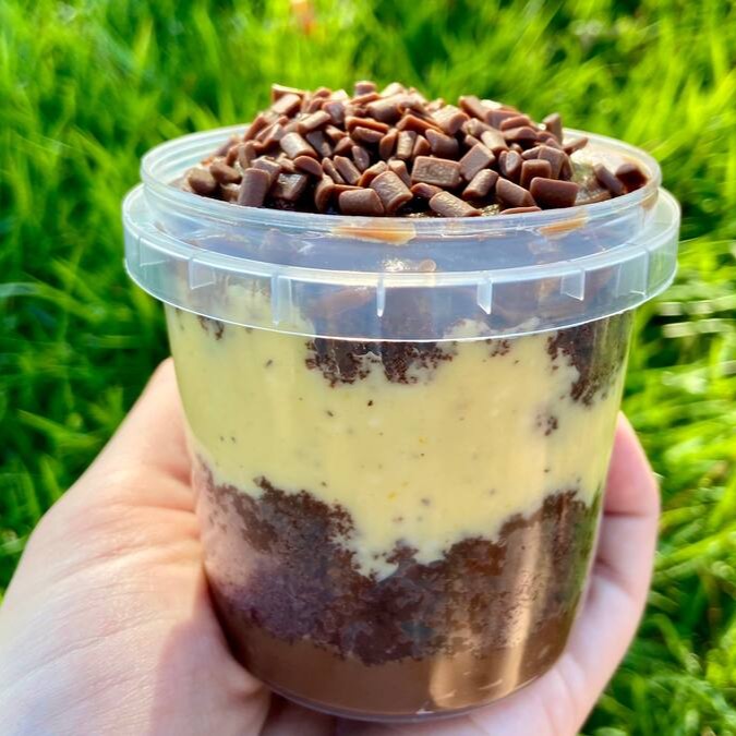 Massa feita com cacau 50%, recheio de brigadeiro de maracujá cremoso (feito com a redução da fruta), brigadeiro de chocolate cremoso, finalizado com granulado nobre. (Nova embalagem pote 220ml).