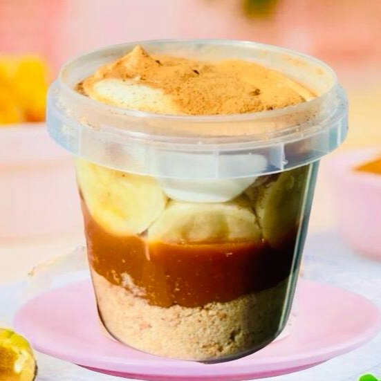 Base de torta (farofa de biscoito maizena amanteigado ), bananas fatiadas (in natura) , doce de leite, finalizado com chantininho e canela em pó. Pote 220ml.