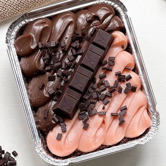 Brownie suculento feito com chocolate nobre blend, coberto metade brigadeiro de morango (feito com nesquik), metade brigadeiro de chocolate cremoso, finalizado com granulado ao leite e chocolate Stikadinho. Aproximadamente 190 gramas.