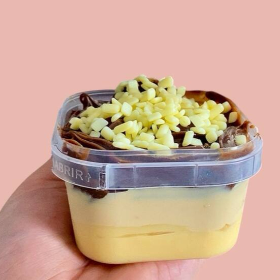 Massa feita com cacau 50%, recheio de brigadeiro de Ninho cremoso, brigadeiro de chocolate cremoso, finalizado com granulado nobre branco e ao leite. (Nova embalagem pote 220ml).