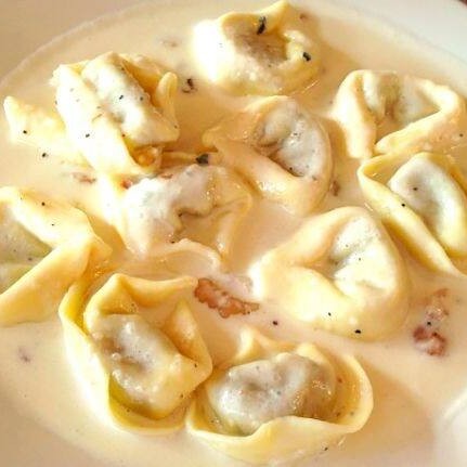 Capeletti de frango salteados com bacon na manteiga, salpicados ao queijo parmesão canastra e coberto com o legítimo molho bechamel com nós moscada.