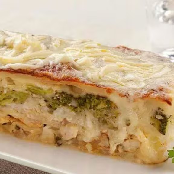 Pasta fresca, camada de molho com brócolis, camada de frango desfiado na manteiga e parmesão gratinado.