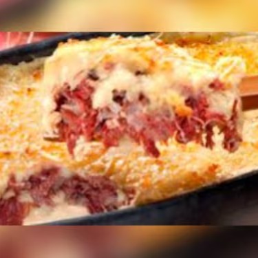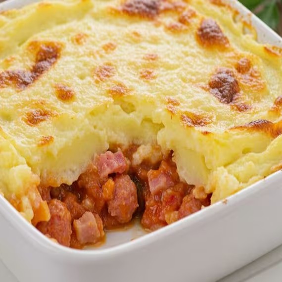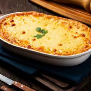 Calabresa e bacon refogados em vinagrete com generosa camada de requeijão cremoso mineiro e cobertura de nosso espetacular mousseline de batatas gratinado com queijo.