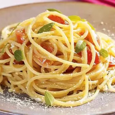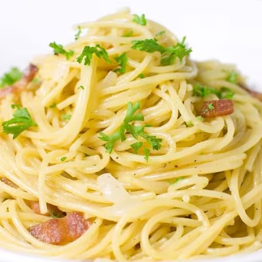 Espaguete al dente, laminas de alho, bacon, parmesão e salsinha