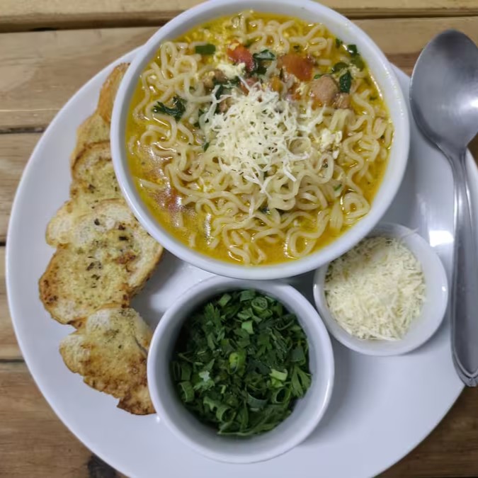 Macarrão instantâneo, cubos de bacon, alho na manteiga, tomatinhos frescos, páprica picante, ovos inteiros cozidos na água levemente mexidos finalizado com cheiro verde frescos e queijo ralado