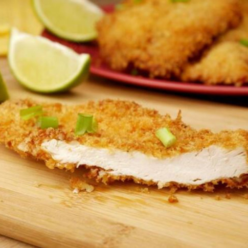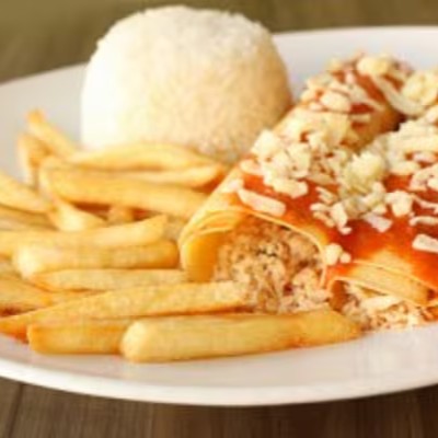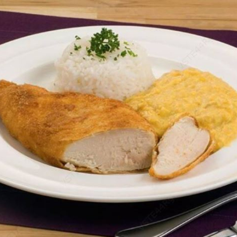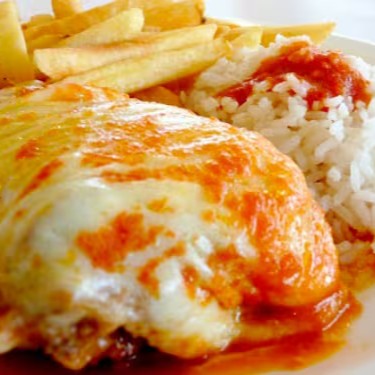 Filé de frango empanado ao molho sugo gratinado com queijo, arroz e fritas.