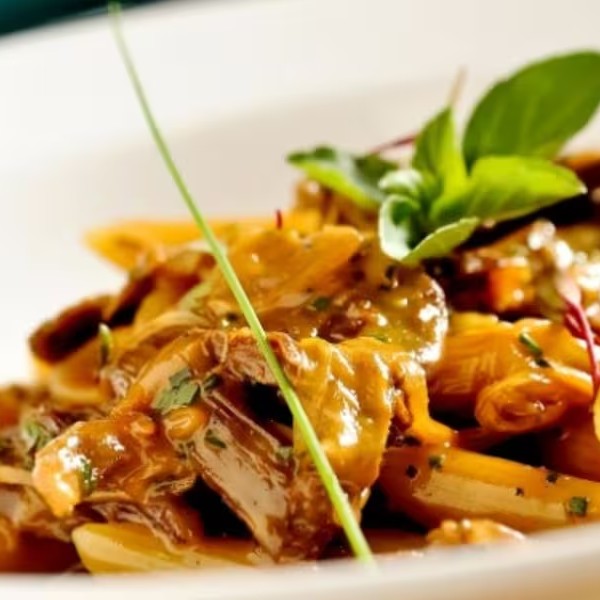 Massa fresca Penne ou talharim coberto com molho vermelho artesanal de carnes desfiadas e especiarias.