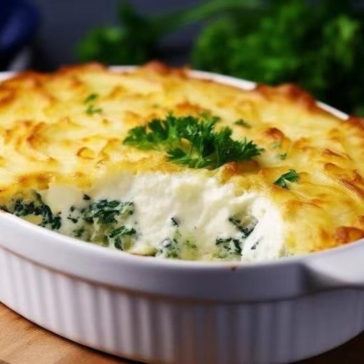 Brócolis salteados na manteiga com delicioso requeijão cremoso mineiro, coberto com nosso incrível mousseline de batatas gratinado com queijo.