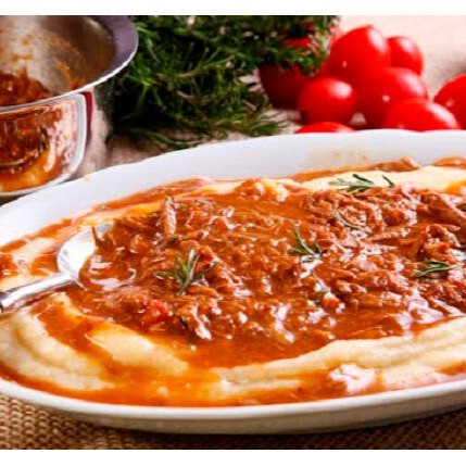 Polenta mimosa temperada e cozida na pressão, com molho de carnes desfiadas (ragu), recheio de queijo canastra, especiarias e ervas