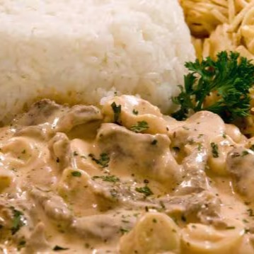 Strogonoff de frango flambados com cogumelos paris, mostarda, extrato de tomates e creme de leite. Acompanha arroz branco e batata palha.