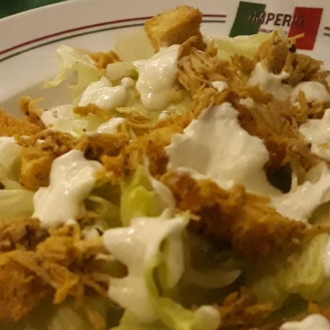 Alface, crutons de pão, frango desfiado, parmesão e molho.