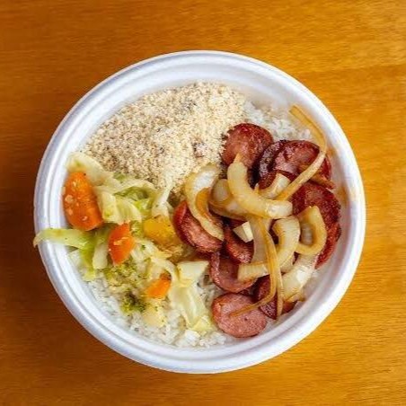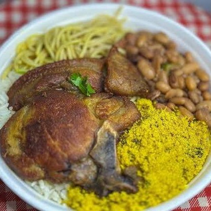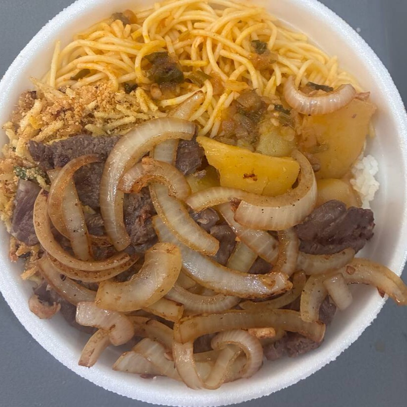 Acompanha arroz soltinho, macarrão saboroso, farofa crocante e refogado. Uma marmita completa, caseira e feita com aquele tempero especial que lembra comida de verdade!