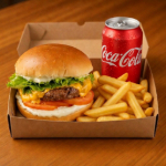 Hambúrguer Tradicional 90g suculento + Batata Frita crocante 200g + Coca-Cola geladinha! Aquele clássico irresistível feito com carinho no Cantinho da Mila: carne bem temperada, pão macio, queijo derretendo… acompanhado da batata dourada e crocante e a Coca-Cola mais gelada da praça! ✅ Hambúrguer tradicional caprichado ✅ Batata frita 200g bem sequinha e saborosa ✅ Coca-Cola original pra refrescar O combo perfeito pra saciar a fome com sabor de verdade e preço que cabe no bolso!