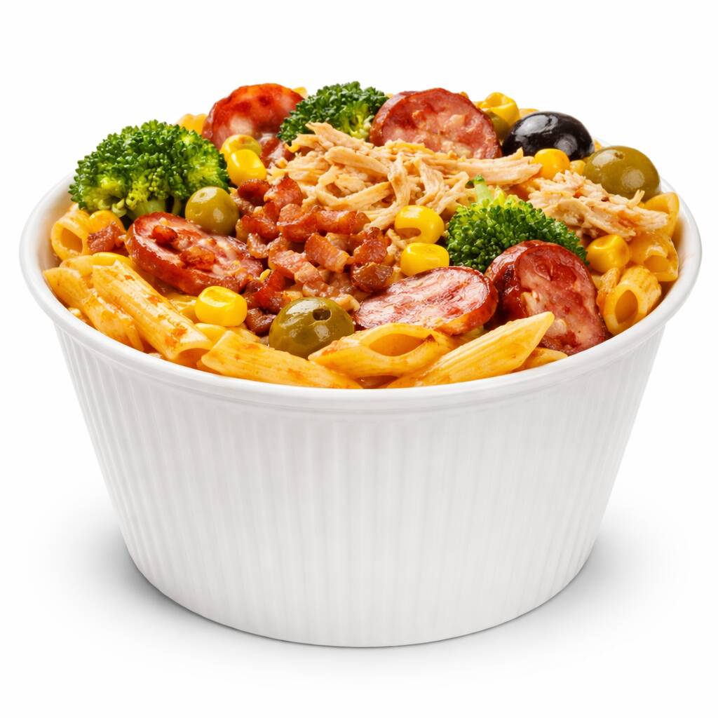 Monte seu macarrão como quiser! 😍 👉 Escolha 1 massa: Penne, Parafuso, Talharim ou Gravata 👉 Escolha até 3 recheios: Milho, Ervilha, Brócolis, Frango, Bacon, Calabresa, Palmito, Carne Moída, Azeitona Preta ou Verde 👉 Escolha até 1 molho: Cheddar, 4 Queijos, Bolonhesa ou Tradicional 📌 Importante: Informe na observação: • 1 Massa + 3 recheios + 1 molho