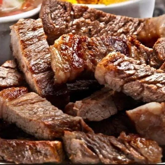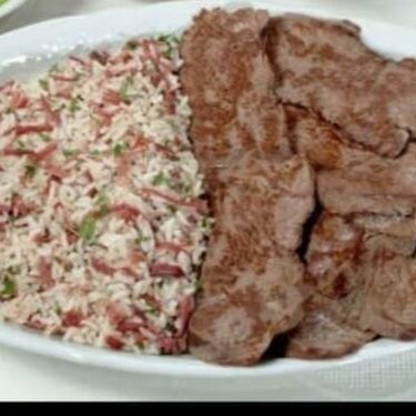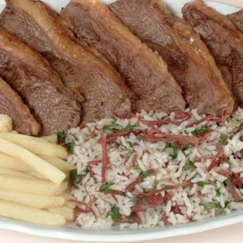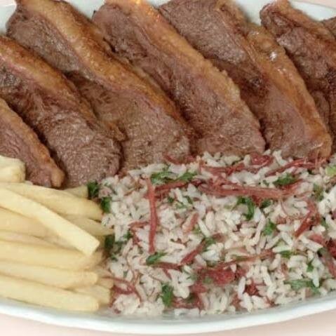 Baby beef fatiado macio e suculento servido no ponto certo. Acompanha arroz carreteiro e fritas.