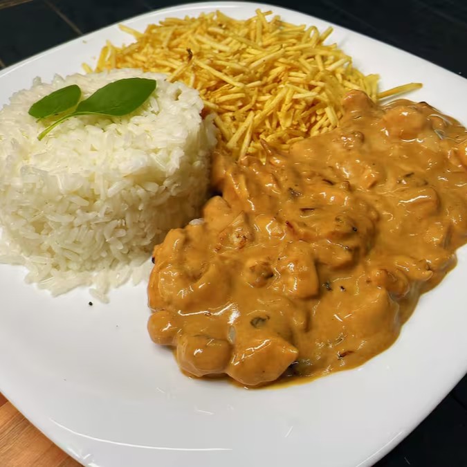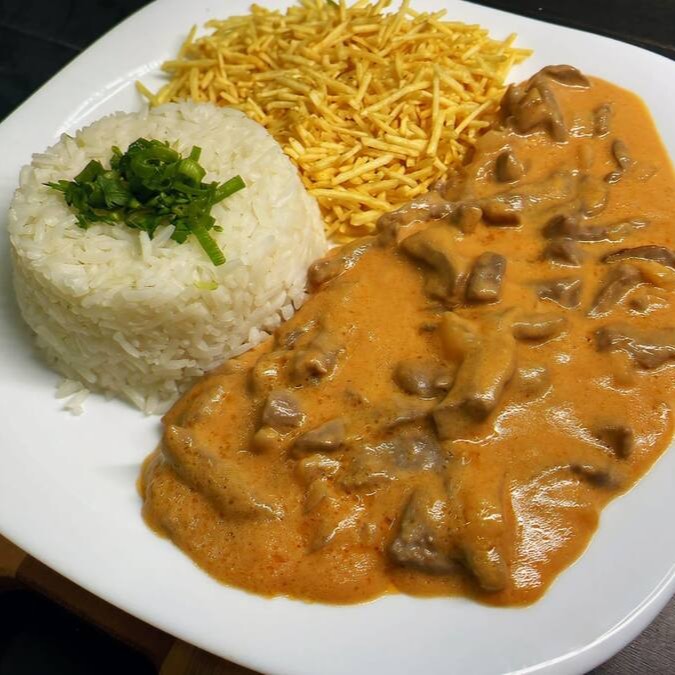 Delicioso e saboroso strogonoff de carne, servido com arroz branco e batata palha.