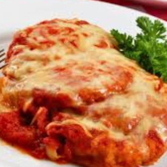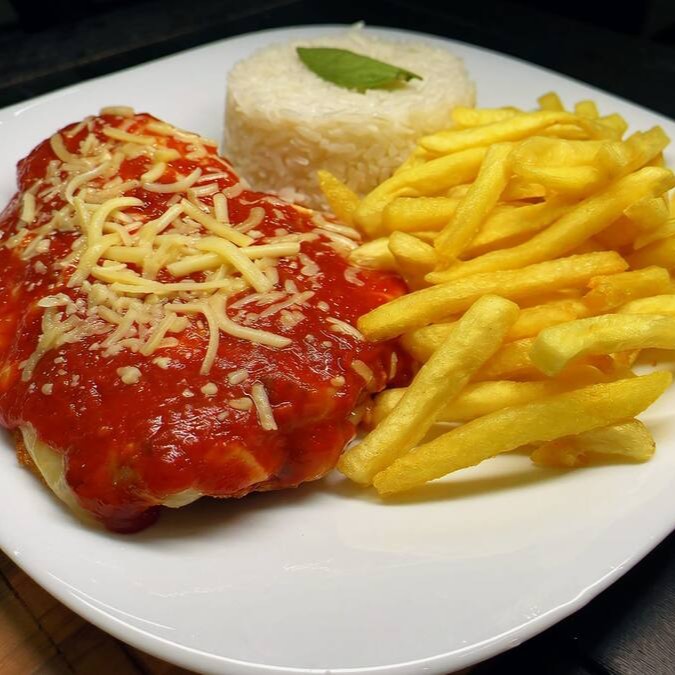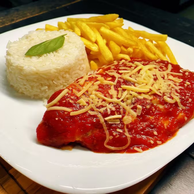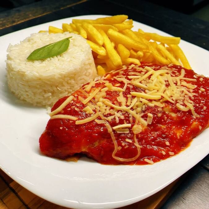 Irresistível: filé bovino macio, empanado no ponto certo, coberto com nosso molho de tomate artesanal e finalizado com queijo derretido acompanha arroz branco e fritas.