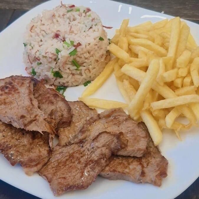 Carne suculenta no ponto certo acompanha arroz carreteiro e fritas.