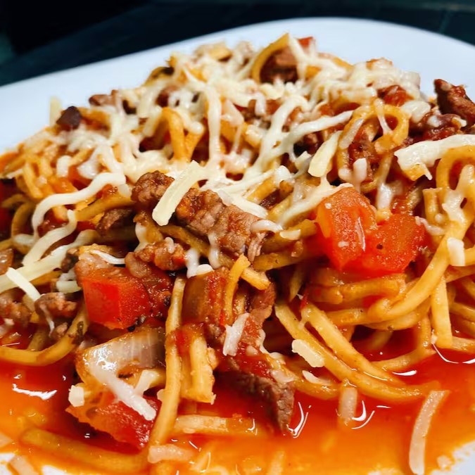 Espaguete cozido no ponto perfeito, envolvido em um molho à bolonhesa rico e encorpado, preparado com carne moída bem temperada, tomates suculentos e aroma de ervas frescas. Um clássico irresistível.