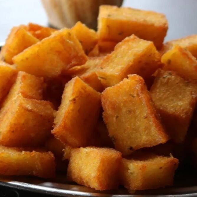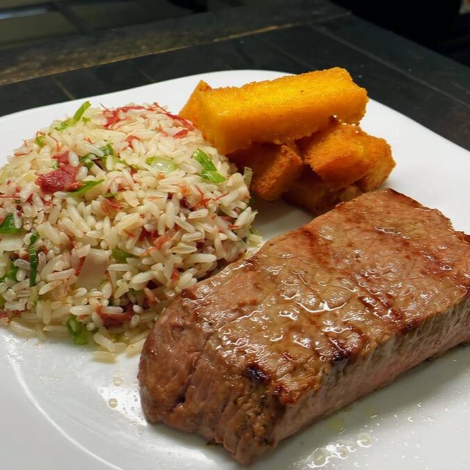 Baby beef macio e suculento servido com delicioso arroz carreteiro e polenta frita caseira.