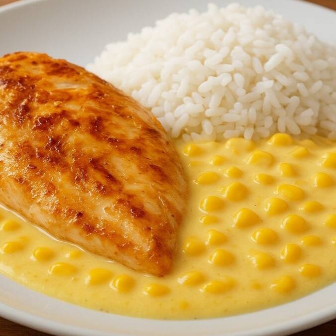 Filé de frango dourado na chapa, suculento por dentro e perfeitamente temperado, servido coberto por um creme de milho cremoso e arroz branco.