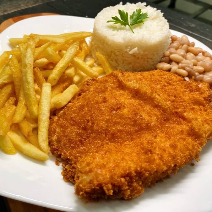 Delicioso frango a milanesa empanado na farinha panco, acompanha arroz branco, feijão e fritas.
