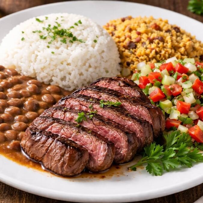 Picanha Grelhada no ponto perfeito, macia e suculenta, servida em porção especial para 2 pessoas. Um sabor irresistível para compartilhar servido com arroz branco, fritas e farofa da casa.