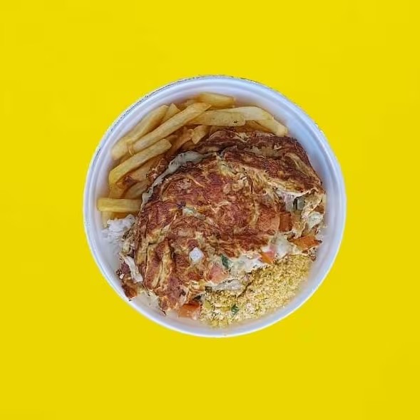 Omelete feito com bacon, presunto, queijo, cebola e cheiro verde. Acompanha arroz, feijão, fritas, farofa