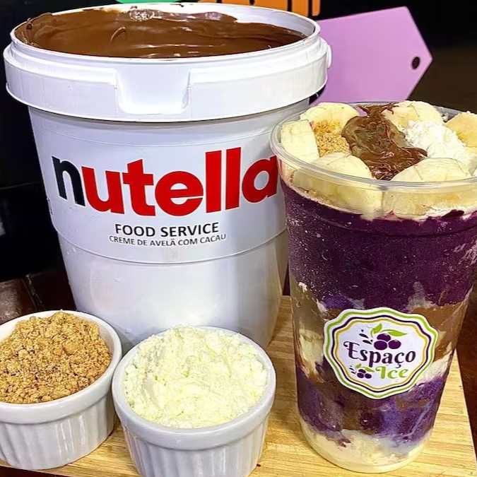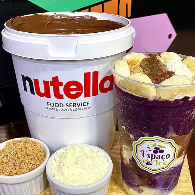 Apresentamos a nossa divina combinação de Açaí com Nutella, meticulosamente disposta ao redor de um copo de 500 ml. A experiência é gloriosamente finalizada com a rica adição de Bombom Ouro Branco e um luxuoso Creme de Leitinho misturado com Nutella.