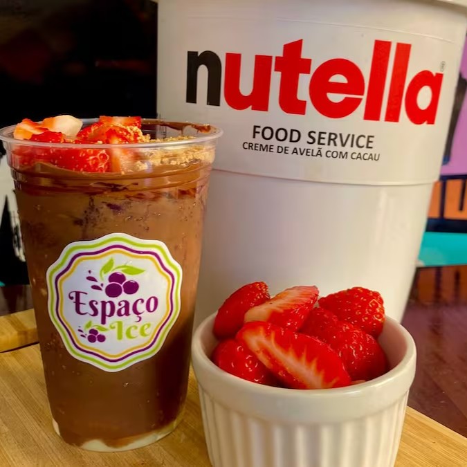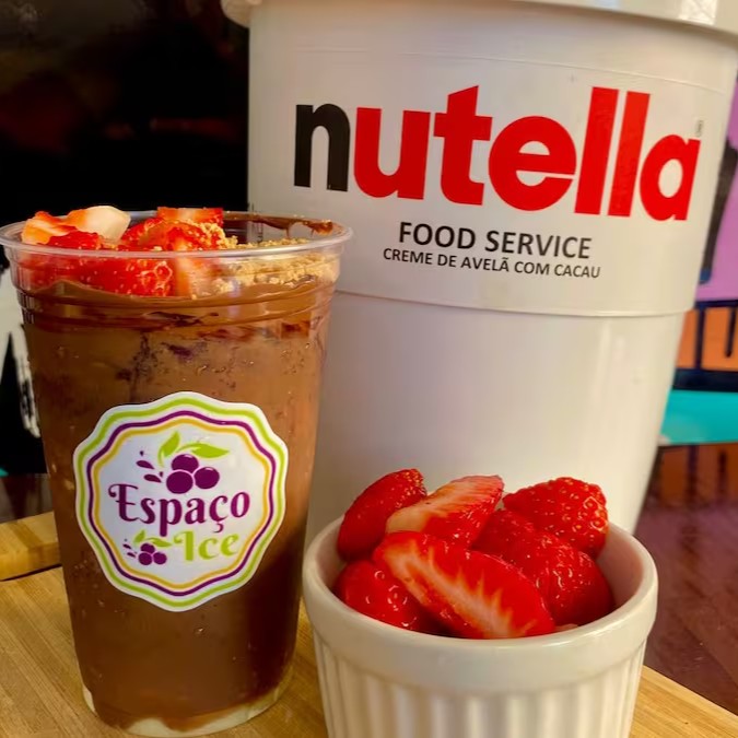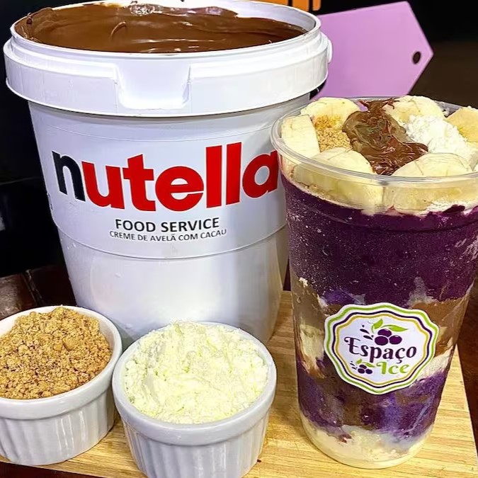 Apresentamos a nossa divina combinação de Açaí com Nutella, meticulosamente disposta ao redor de um copo de 300 ml. A experiência é gloriosamente finalizada com a rica adição de Bombom Ouro Branco e um luxuoso Creme de Leitinho misturado com Nutella.