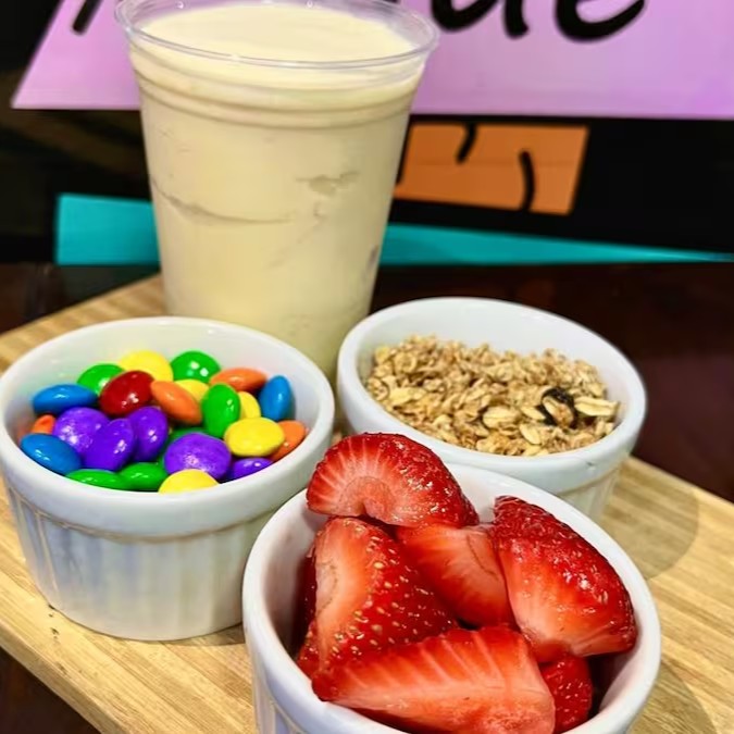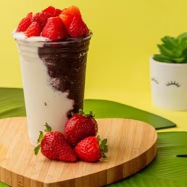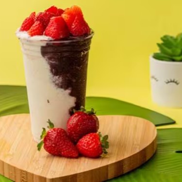 Acrescentado a essa mistura, morangos frescos, trazendo sua doçura natural e um toque de frescor. Acompanha um generoso fio de leite condensado e uma pitada de leite em pó, proporcionando uma experiência cremosa sem igual.