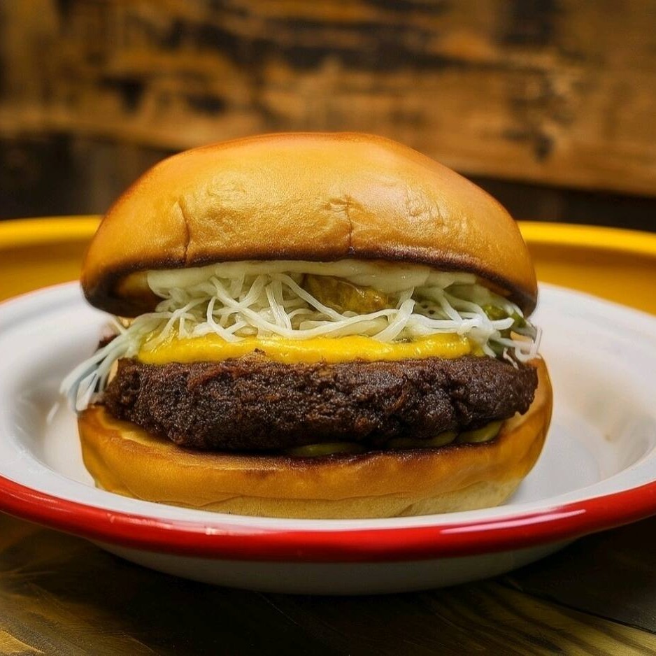 Pão de brioche, falafel de 150 gramas, amba(chutney de manga), repolho, maionese vegana ou tradicional, pickles.
