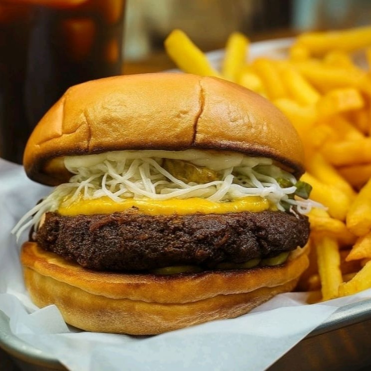 Pão de brioche artesanal, 2 smash suculentos de 75g cada, queijo americano artesanal, pickles, cebola, bacon e maionese Capy's.