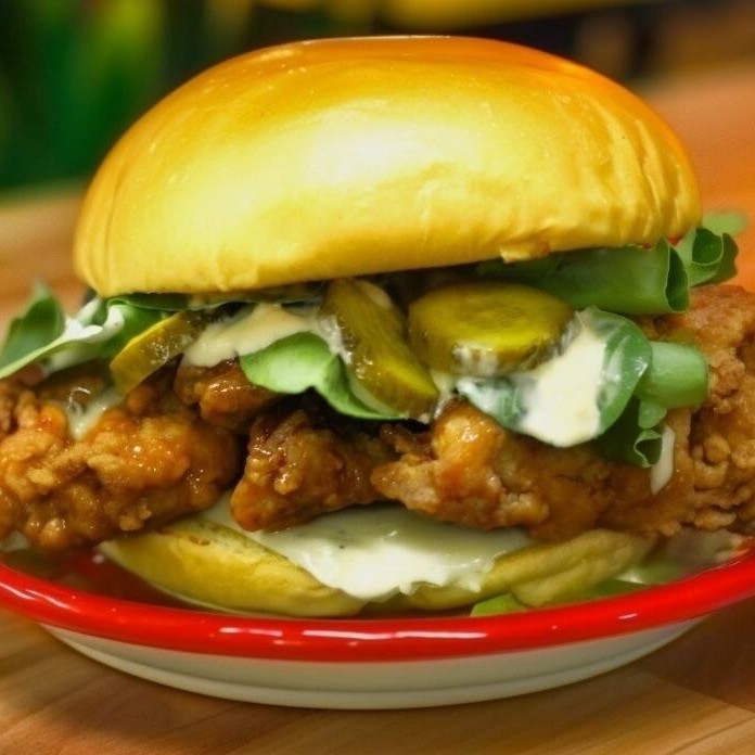 Pão de brioche, sobrecoxa marinada por 24hrs, empanada e banhada no molho honey buffalo (apimentado adocicado) queijo americano, picles e maionese Capy's.