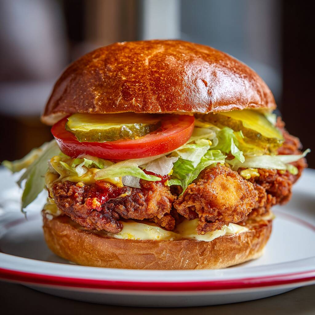 Pão de brioche, sobrecoxa marinada por 24hrs, empanada, frita e finalizada com lemon pepper, queijo americano, alface, tomate picles e molho secreto.