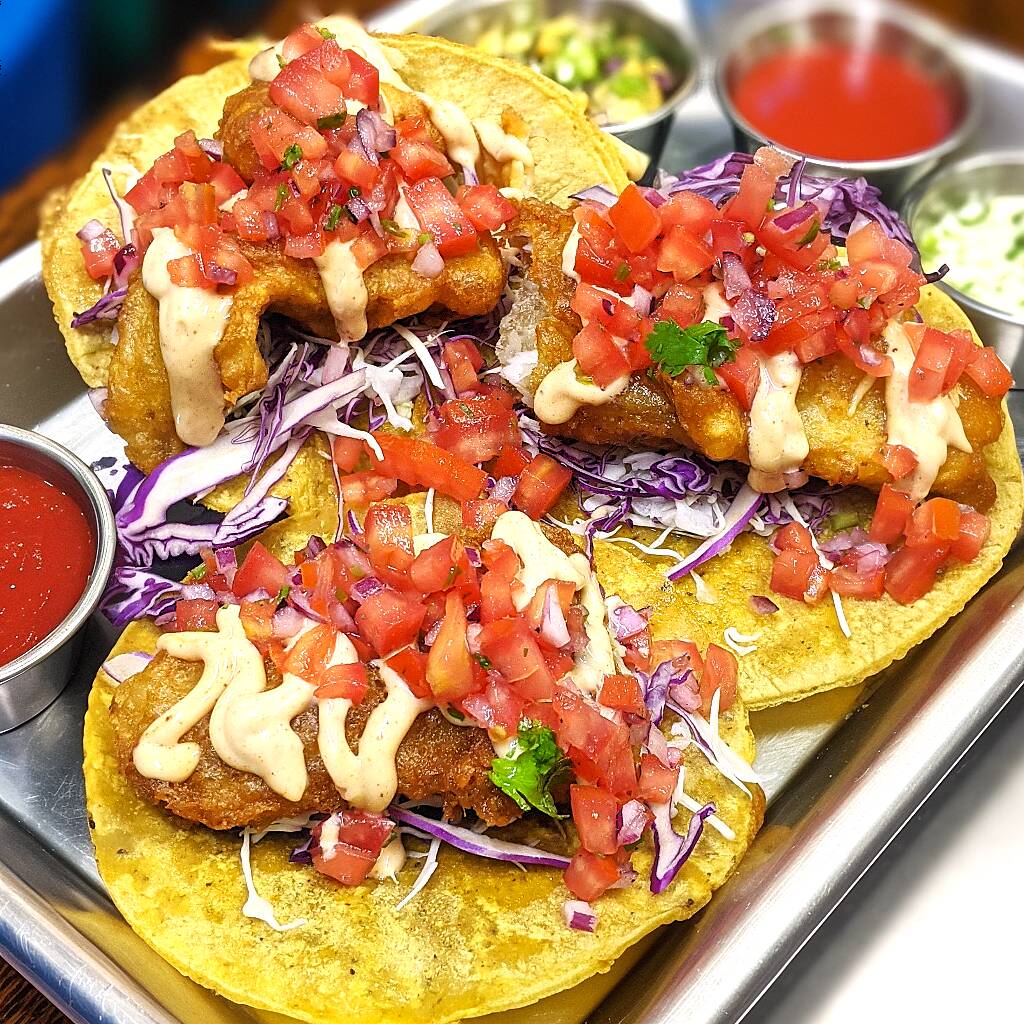 Tacos estilo ensenada, tílapia frita em massa crocante estilo tempura ou grelhada, salada de repolho, pico de gallo e maionese de chipotle.