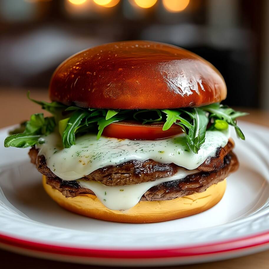 Dois smash suculentos com gorgonzola derretido, tomate, rúcula e maionese de ervas no pão brioche.